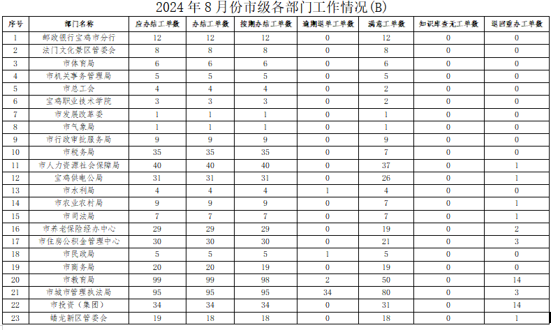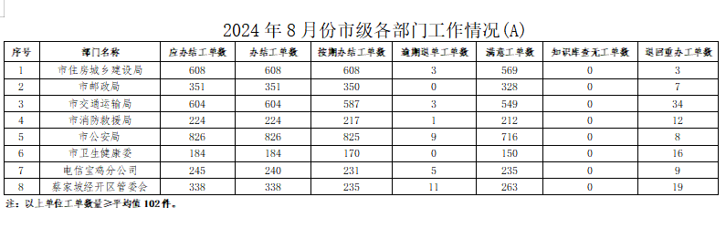 2024年8月份,寶雞市12345政務(wù)服務(wù)便民熱線(“有問(wèn)必應(yīng)、接訴即辦”平臺(tái))受理企業(yè)和群眾訴求42001件,應(yīng)辦結(jié)40888件,辦結(jié)40753件,總體辦結(jié)率99.67%。其中12345熱線渠道受理訴求41392件(包括來(lái)電39005件、省12345交辦1147件、微信公眾號(hào)留言1064件、政府網(wǎng)站留言176件),應(yīng)辦結(jié)40263件,辦結(jié)40134件,辦結(jié)率99.68%;市長(zhǎng)信箱收到來(lái)信共519件,應(yīng)辦結(jié)521件,辦結(jié)519件,辦結(jié)率99.62%;人民網(wǎng)領(lǐng)導(dǎo)留言板留言72件,應(yīng)辦結(jié)93件,辦結(jié)89件;西部網(wǎng)留言18件,應(yīng)辦結(jié)11件,辦結(jié)11件。